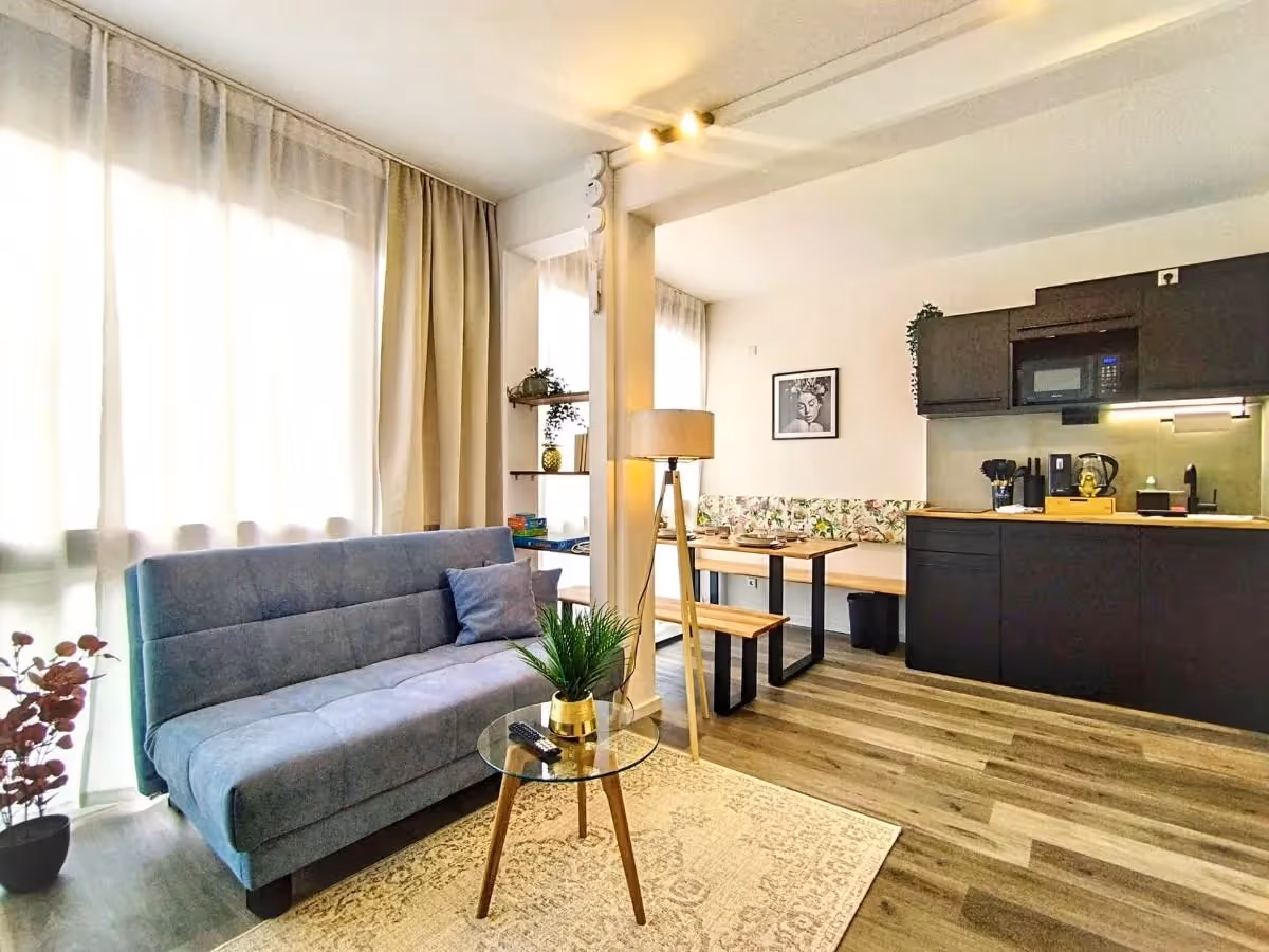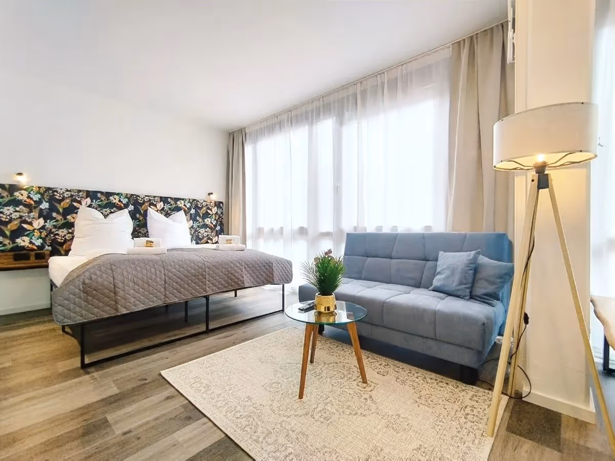 Willkommen in deiner modernen, hochwertig ausgestatteten Studio-Wohnung in der Nürnberger Nordstadt! Auf 27 m² erwarten dich ein Kingsize-Bett, ein hochwertiges Schlafsofa, eine voll ausgestattete Küche, Fußbodenheizung sowie ein 55-Zoll-Smart-TV mit Disney+ & Wii. Babybett & Hochstuhl stehen kostenfrei bereit. Einkaufsmöglichkeiten, Bushaltestelle und Altstadt sind schnell erreichbar. Tiefgaragenplatz inklusive – Dachterrasse zur Mitnutzung!