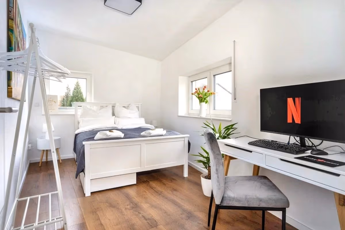 Willkommen in deinem modernen Apartment mit XXL Wohnzimmer, zwei Schlafzimmern mit Queen-Size-Betten und einem komfortablen Schlafsofa. Die voll ausgestattete Küche, ein 50-Zoll-Smart-TV mit Soundbar und Disney+, zwei Arbeitsplätze mit Bildschirm sowie Terrasse, Waschmaschine und Trockner bieten höchsten Komfort. Die Altstadt erreichst du bequem zu Fuß. Ein Parkplatz direkt vor der Tür und weitere kostenfreie Stellplätze stehen zur Verfügung.