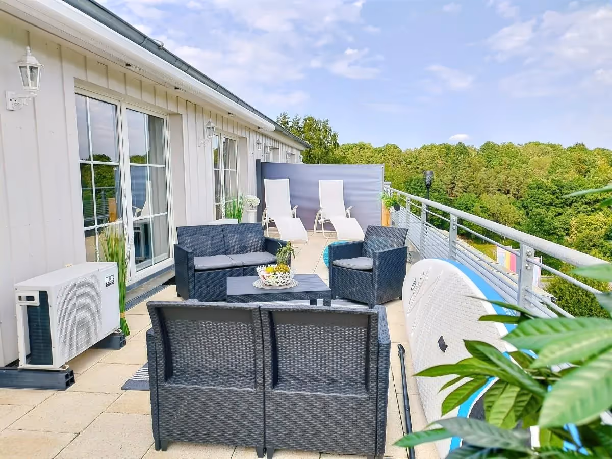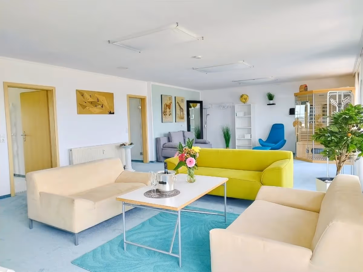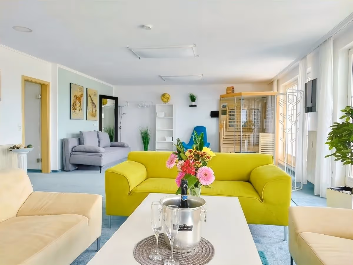 Erlebe exklusives Wohnen mit Dachterrasse und Seeblick! Dieses lichtdurchflutete Penthouse am Brombacher See bietet dir auf 218 m² Wohnfläche und 55 m² Terrasse viel Raum zum Entspannen – mit Sauna, moderner Küche, großem Esstisch, 5 Smart-TVs (inkl. 70" & Soundbar), Disney+, Wii und Arbeitsplatz. 3 Schlafzimmer, hochwertige Schlafplätze & 3 Tiefgaragenplätze inklusive. Nur 10 Min. zu Fuß zum See, 30 Min. nach Nürnberg!