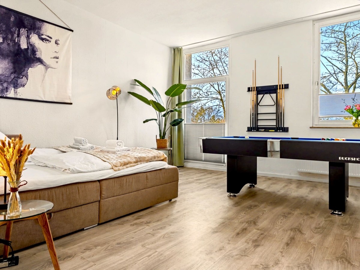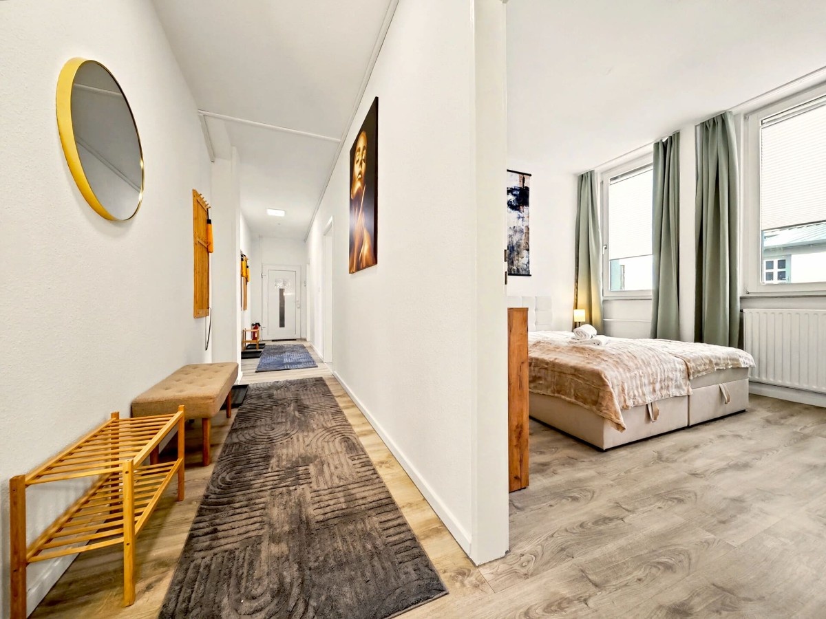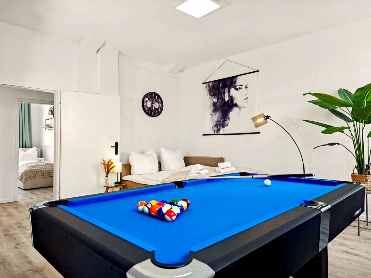 Großzügiges, lichtdurchflutetes 145 m² Loft mit Infrarotsauna, Billiardtisch und Retro-Konsole für Entertainment. Ruhig gelegen im Industrieviertel der Nordstadt – nur 10 Min zur Messe, Innenstadt und Flughafen. Mit 4 Schlafzimmern, zusätzlicher Schlafmöglichkeit im Wohnzimmer, 3 Bädern, großer Küche mit Esstisch für 14 Personen und kostenfreien Parkplätzen ideal für Gruppen. Smart-TVs, Disney+ und zwei Workspaces inklusive.